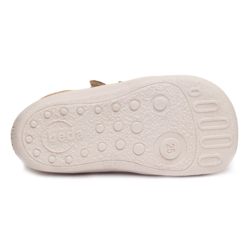Beda Bella jsou dětské celoroční kožené boty se zapínáním na suchý zip. Povrchová úprava boty je broušená kůže v béžové třpitivé barvě. Reflexní prvek na suchém zipu. Vyjímatelná vložka bez klenby z povrstvené usně.