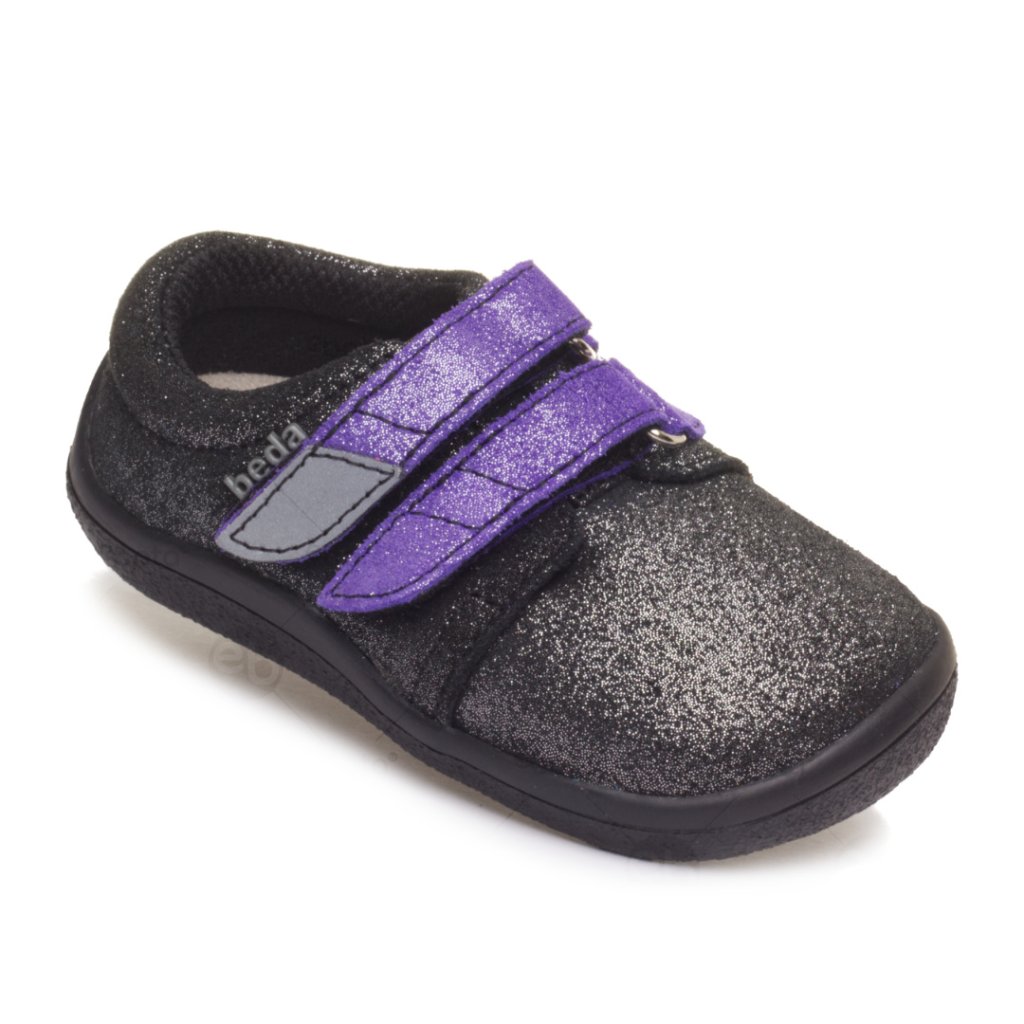 Beda Dark Violette jsou dětské celoroční kožené boty se zapínáním na suchý zip. Povrchová úprava boty je broušená kůže v černé barvě se třpitkami. Reflexní prvek na suchém zipu. Vyjímatelná vložka bez klenby z povrstvené usně.