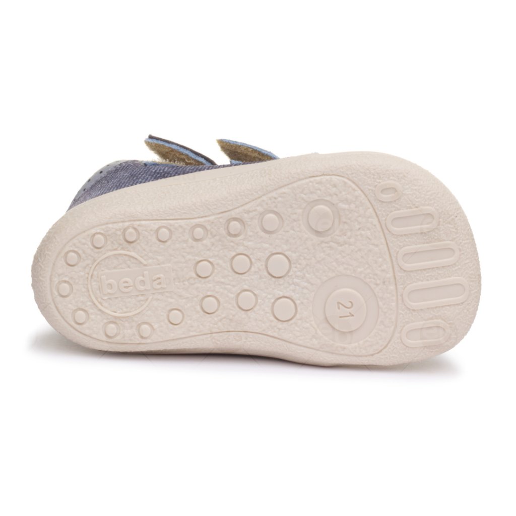 Beda Denis-2 jsou dětské celoroční kožené kotníkové boty se zapínáním na suchý zip. Upravený střih pro užší kotník. Povrchová úprava boty je broušená kůže v šedé barvě (denim) s laminovanou membránou TE-POR. Reflexní prvek na suchém zipu a kolem kotníčku. Vyjímatelná vložka bez klenby z povrstvené usně.