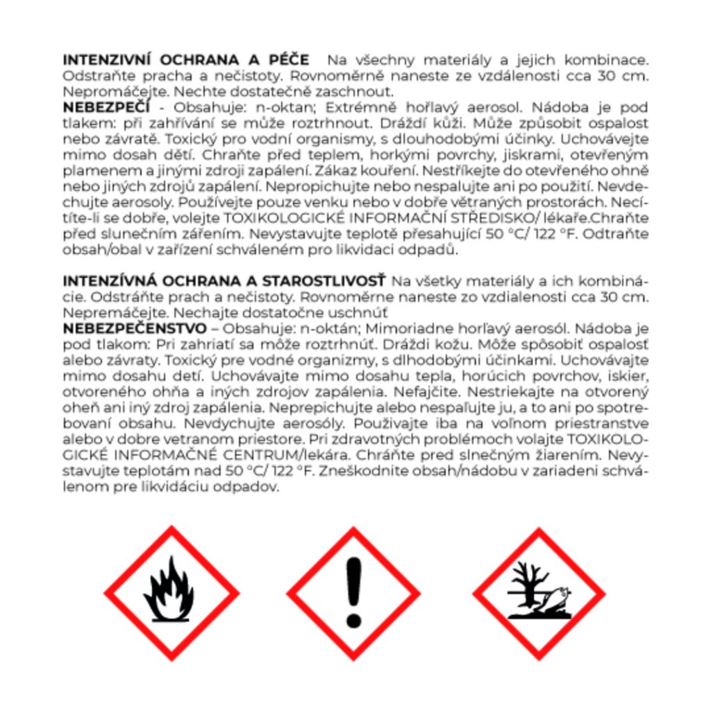 Sprej není vhodný na lakovanou a maštěnou kůži a koženku, tedy materiály které nesají a impregnace se do nich nemůže dostat, vsáknout.