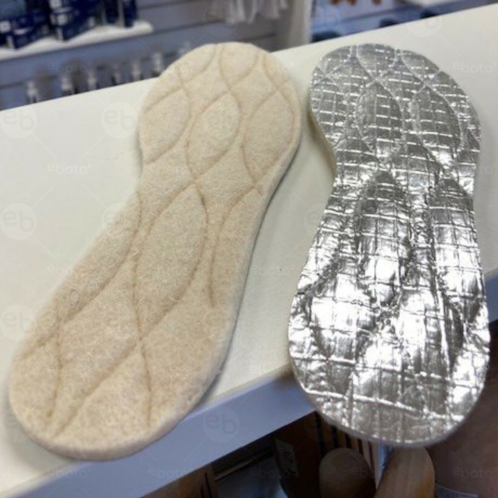 Zateplovací vložky (stélky) do bot Shoeboy's Thermo z pravé ovčí vlny na měkké latexové pěně s hliníkovou fólií na spodní straně. Pro výrobu vložek je použita pravá ovčí střižní vlna s dlouhým vlasem, která výborně hřeje. Spodní hliníková vrstva udržuje teplo u nohy a drží zimu od těla.