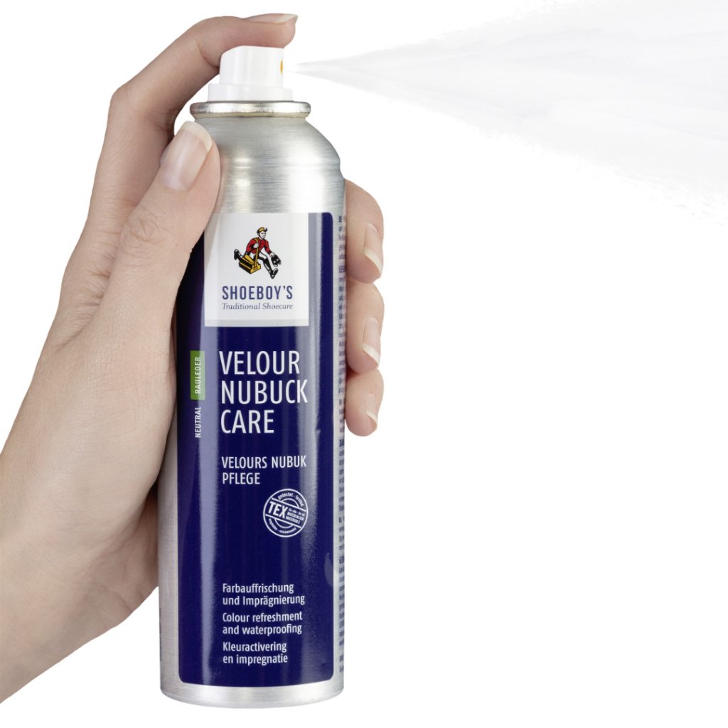 Shoeboy's VELOUR NUBUCK CARE je vyživující sprej určený pro semiš (velur) a nubuk. Sprej současně impregnuje a je tak vhodný také pro všechny kožené výrobky s TEX membránami (Goretex®, Sympatex® aj.). Po aplikaci zůstává impregnovaný materiál plně prodyšný.